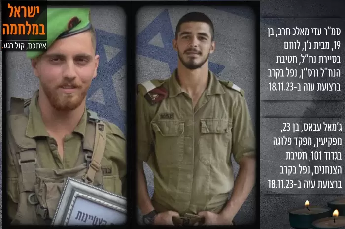 מדינת ישראל והעדה הדרוזית מבכה שניים מבניה שנפלו בסוף השבוע בקרבות ברצועת עזה. סמ״ר עדי מאלכ חרב, בן 19, מבית ג'ן, לוחם בסיירת נח"ל, חטיבת הנח"ל ורס"ן ג'מאל עבאס, בן 23, מפקיעין, מפקד פלוגה בגדוד 101, חטיבת הצנחנים.