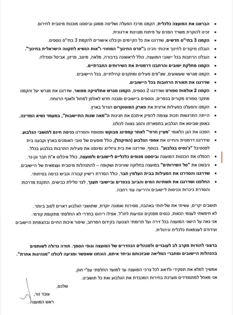 כפי שפורסם אתמול לראשונה ב"קול רגע" ראש המועצה האזורית הגלבוע, עובד נור הודיע שלא יתמודד בבחירות הקרובות על ראשות המועצה.