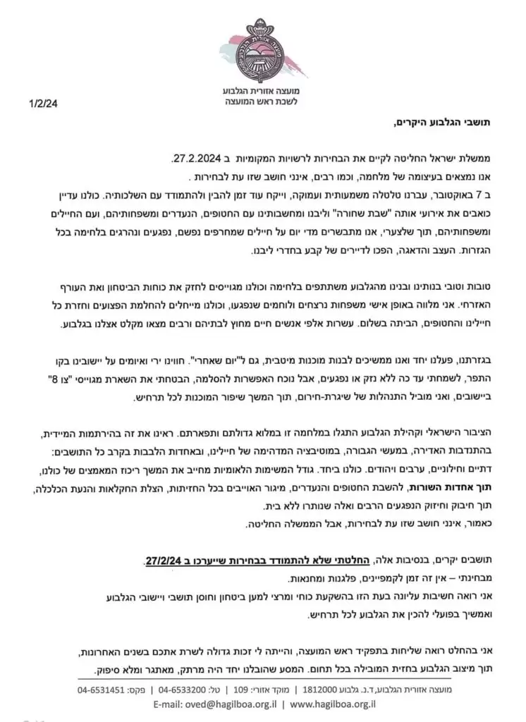 דרמת הענק בגלבוע החלה אתמול בהודעות וצאפ שהופצו ביישובי המועצה שבהן קריאה לנור לחזור בו מהחלטתו לפרוש מהמרוץ. לאורך היום ניסו פעילים פוליטיים לשנות את ההחלטה ול"קול רגע" נודע כי אמש עד השעות הקטנות של הלילה קיים נור פגישה עם אנשי המטה. בסיומה של הפגישה לא התקבלה החלטה רשמית. קודם לפגישה זו נפגש נור גם עם עיד סלים ואנשי מועצה נוספים שסיפרו שקיבלו תחושה שנור חזר וכן יתמודד אך כאמור בשעה האחרונה נפלה ההחלטה ונור פרסם רשמית הודעה רשמית בה קשר בין אירוע ה-7.10 להחלטה לפרוש וביקר את הממשלה על החלטתה לקיים בחירות בזמן מלחמה: "ממשלת ישראל החליטה לקיים בחירות ב-27.02.24. אנו נמצאים בעיצומה של מלחמה וכמו רבים אינני חושב שזו עת לבחירות…. בנסיבות אלה החלטתי שלא להתמודד בבחירות. מבחינתי אין זה זמן לקמפיינים, פלגנות ומחנאות. אני רואה חשיבות עליונה בעת הזו בהשקעת כוחי ומרצי למען ביטחון וחוסן תושבי ויישובי הגלבוע ואמשיך בפועלי להכין את הגלבוע לכל תרחיש".