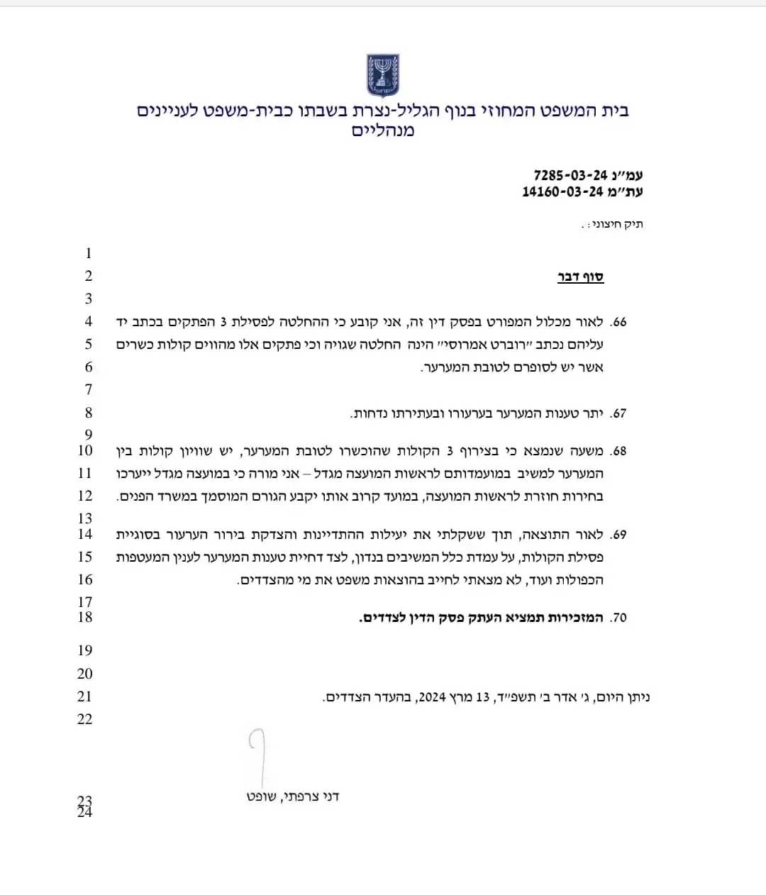 בפסקתו כתב השופט דני צרפתי: "אני קובע כי ההחלטה לפסילת 3 הפתקים בכתב יד עליהם נכתב "רוברט אמרוסי" הינה החלטה שגויה וכי פתקים אלו מהווים קולות כשרים אשר יש לסופרם לטובת המערער (אמרוסי, ר.א). יתר טענות המערער בערעורו ובעתירתו נדחות. משעה שנמצא כי בצירוף 3 הקולות שהוכשרו לטובת המערער, יש שוויון קולות בין המערער למשיב במועמדותם לראשות המועצה מגדל – אני מורה כי במועצה מגדל יערכו בחירות חוזרות לראשות המועצה, במועד קרוב  אותו יקבע הגורם המוסמך במשרד הפנים".
