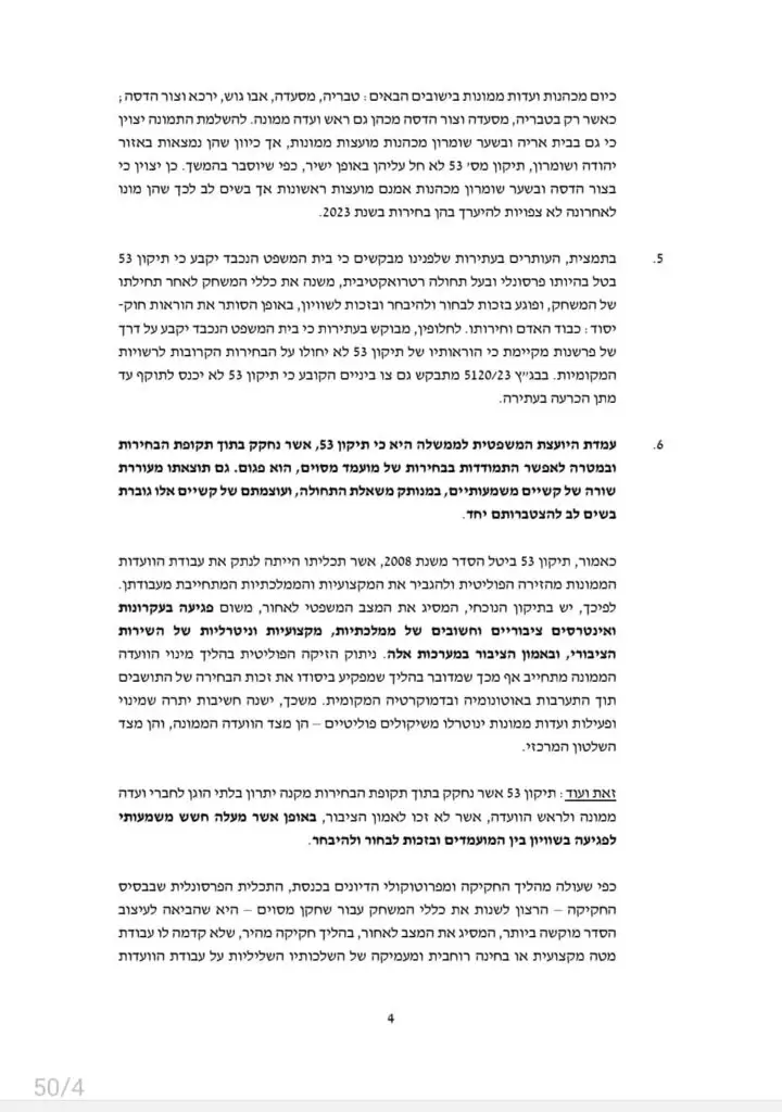 על פי בהרב-מיארה: "יש בתיקון הנוכחי, המסיג את המצב המשפטי לאחור, משום פגיעה בעקרונות ואינטרסים ציבוריים וחשובים של ממלכתיות, מקצועיות וניטרליות של השירות הציבורי, ובאמון הציבור במערכות אלה. ניתוק הזיקה הפוליטית בהליך מינוי הוועדה הממונה מתחייב אף מכך שמדובר בהליך שמפקיע ביסודו את זכות הבחירה של התושבים תוך התערבות באוטונומיה ובדמוקרטיה המקומית. משכך, ישנה חשיבות יתרה שמינוי ופעילות ועדות ממונות ינוטרלו משיקולים פוליטיים – הן מצד הוועדה הממונה, והן מצד השלטון המרכזי. התיקון, אשר נחקק בתוך תקופת הבחירות, מקנה יתרון בלתי הוגן לחברי ועדה ממונה ולראש הוועדה, אשר לא זכו לאמון הציבור באופן אשר מעלה חשש משמעותי לפגיעה בשוויון בין המועמדים ובזכות לבחור ולהיבחר".
