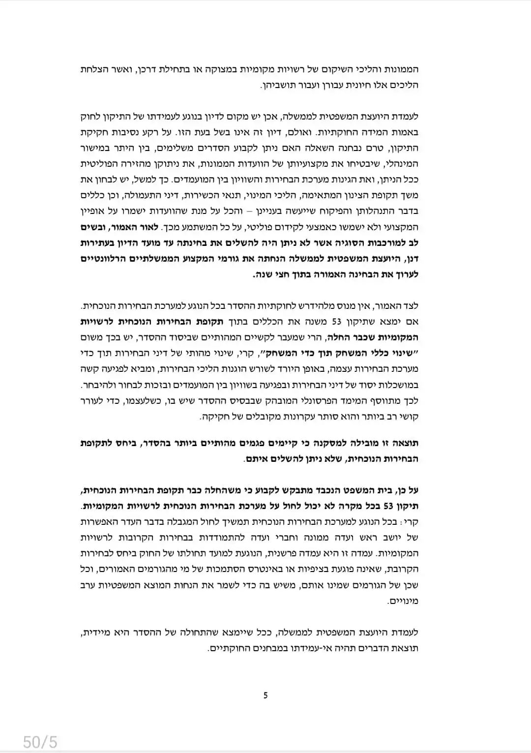 ארבעה ימים לפני הדיון בבג"צ פרסמה הערב (ד') היועצת המשפטית של הממשלה, גלי בהרב-מיארה את התייחסותה לחוק שזכה לכינויים "חוק טבריה" ו"חוק בועז יוסף". בעמדתה קבעה היועצת כי לא ניתן להחיל את החוק על הבחירות הקרובות בטבריה אלא בבחירות הבאות.