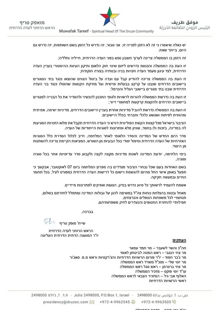 נזכיר כי בראיון בתוכנית "מדברים ברדיו" תקף השבוע ראש המועצה ביאנוח-ג'ת, מועדאד סעד, את מחוקקי חוק הלאום וקרא לתקנו והיום (ג') שיגר הראש הרוחני לעדה הדרוזית, מואפק טריף מכתב דחוף לראש המל"ל ולשרים ובו קריאה לתיקון חוק הלאום.