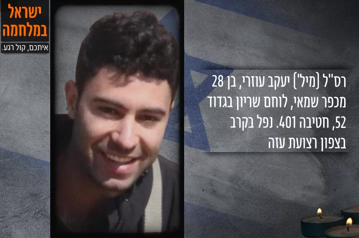 רס"ל (מיל') יעקב עוזרי, בן 28 מכפר שמאי, לוחם שריון בגדוד 52, חטיבה 401. נפל בקרב בצפון רצועת עזה. יעקב, אחד מבין שבעה אחים, לא הוקפץ לדרום אבל נאבק להגיע ולהילחם. הוא נפל חודש אחרי שאיבד חברים במסיבת הפסיידק בבוקר ה-7.10. במוצאי השבת לפני שנכנס לעזה הוא עוד הספיק לדבר עם אימו במה שהפכה לשיחת הפרידה. הוא הניח אחריו הורים, אחים ובת זוג בהיריון.