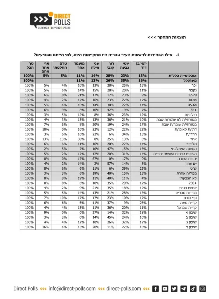 סקר שקיימה מפלגת "הליכוד" מעלה כי ליוסי נבעה הסיכויים הגבוהים ביותר לנצח בבחירות בטבריה. על פי ממצאי הסקר שבוצע על ידי חברת דיירקט פולס ב-14 בנובמבר ובו נדגמו 618 בני 18 ומעלה המהווים מדגם מייצג של תושבי טבריה. טעות הדגימה על פי הסקר 4.1 אחוזים.