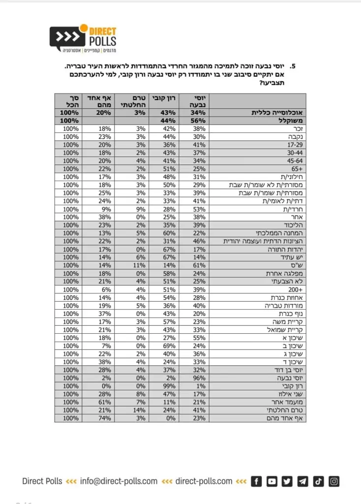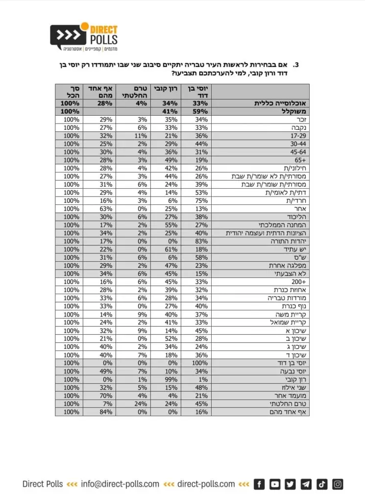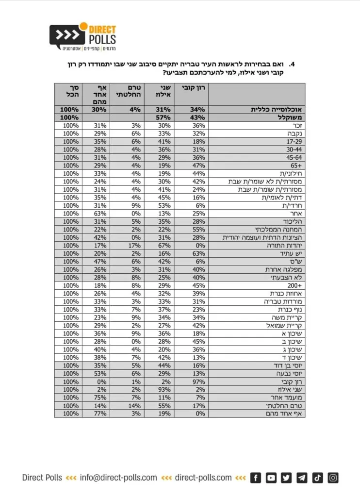 במקרה של סיבוב שני עולה כי כל מי שיעלה לסיבוב השני ינצח את קובי. במידה ויהיה זה יוסי בן דוד הוא יזכה לרוב של 59 אחוזים לעומת 41 אחוזים של רון קובי, שני אילוז זוכה לרוב של 57 אחוזים לעומת 43 אחוזים של קובי ויוסי נבעה לרוב של 56 אחוזים.