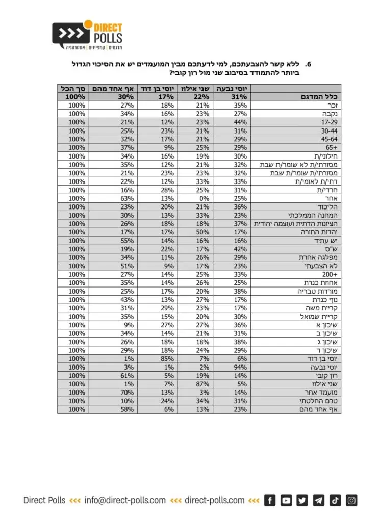 עוד בדק הסקר מה יקרה בסיבוב השני כשעל פי הבדיקה של בחינת כלל המועמדים נבעה זוכה לרוב של 31 אחוזים להעפיל לסיבוב השני, שני אילוז ל-22 אחוזים ויוסי בן דוד רק ל-17 אחוזים.